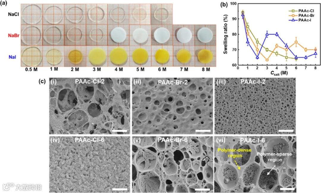 图1. 共离子特异性效应介导的PAAc凝胶的相分离及其随盐浓度和盐种类的收缩规律。