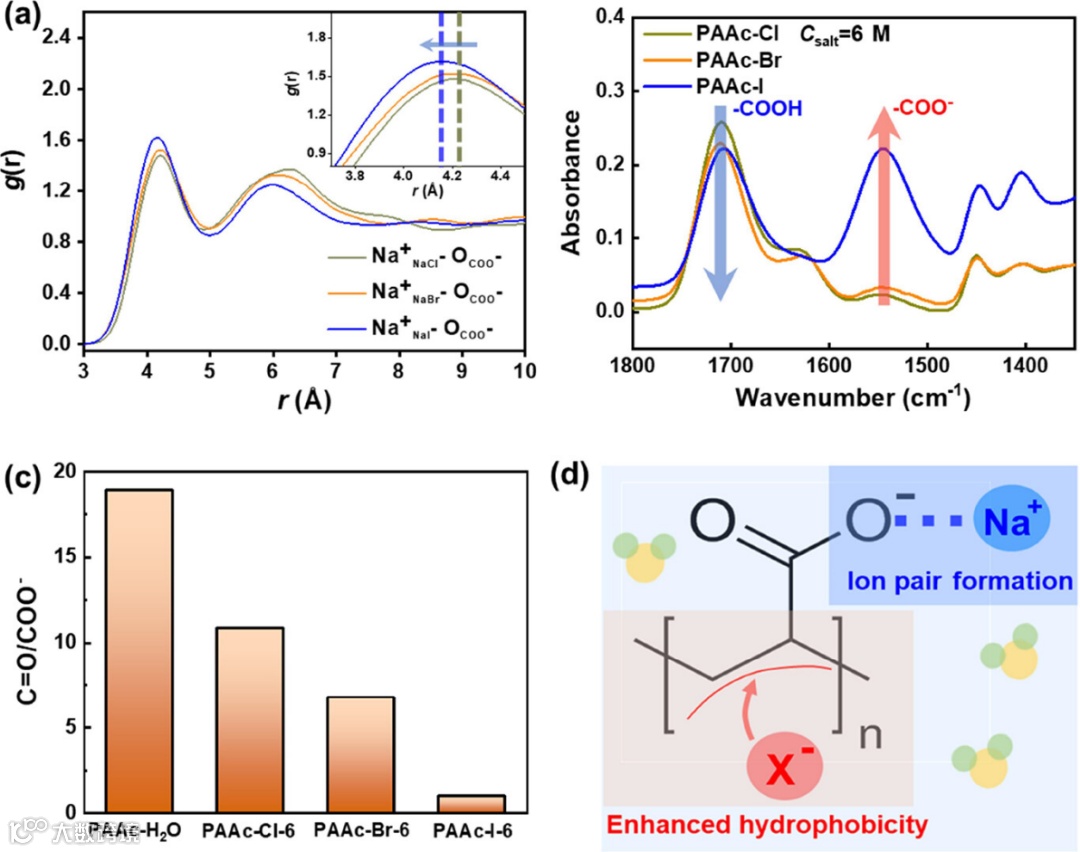 图5. (a) 具有不同共离子的 AAc 单体的钠离子和羧基之间的径向分布函数 (RDF)。(b) 各种钠盐中平衡的 PAAc-SN 凝胶的 FTIR 光谱,以及 (c) 未解离的 -COOH 和解离的 -COO- 的相应相对比例。(d) 卤化钠诱导 PAAc 凝胶相分离的机制。
