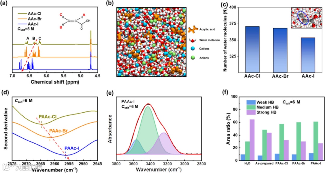 图4. (a) 不同卤化钠中 AAc 的 1 H NMR 谱。(b) 从 6 M NaI 溶液中的 AAc 获得的分子级模拟快照。所有模拟均在 294 K 下进行。(c) 从 MD 模拟获得的 CH2=CH− 碳原子周围的水分子数。(d) PAAc-Cl-6、PAAc-Br-6 和 PAAc-I-6 的二阶导数曲线。(e) PAAc-I-6 中水的拟合 ATR-FTIR 光谱。(f) 不同 PAAc 凝胶中水的强、中、弱 HB 的面积比总结。
