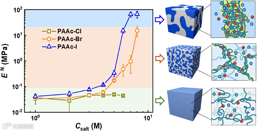 图7. 平衡 PAAc 水凝胶的归一化杨氏模量 EN 以及不同物种卤化钠和 Csalt 中可能的链构象变化的示意图。