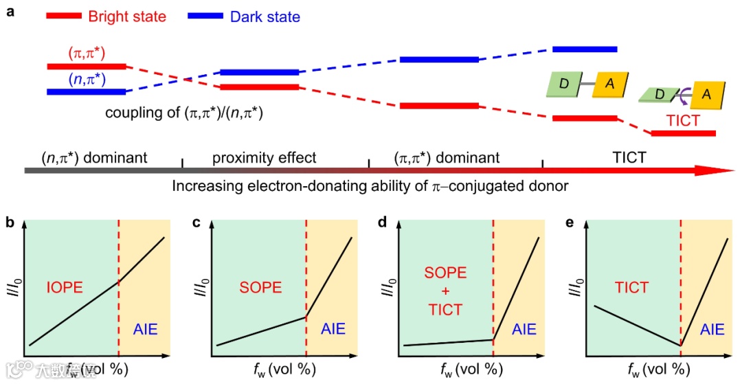 基于此,作者总结了通过π电子给体调控含杂环AIEgens的邻近效应及其光物理性质的理想模型(图4)。从甲基喹喔啉母核(MQ)到具有给电子取代基的三个衍生物(SQ, MeOSQ和DPASQ),(n, π*)和(π, π*)态的能级分别呈现出上升和下降的趋势。因此,两个跃迁态会发生能级交叉,它们之间的电子耦合作用和邻近效应也呈现出先增强后减弱的特征。四个AIEgens在四氢呋喃/水的混合溶液中随着水含量增加也呈现出不同的光物理性质变化趋势:(1)当(n, π*)占据最低能级时,环境极性的增加会缩小两个态之间的能差并增强耦合作用,从而促进(π, π*)态的辐射跃迁并增强发光。因此,我们将以MQ为例的这种现象称为诱导邻近效应(Induction of proximity effect, IOPE)(图4b);(2)当引入苯环使得 (n, π*)和(π, π*)的能级十分接近时,环境极性的增加会逐渐增大两个态之间的能差并减弱耦合作用,从而抑制非辐射跃迁并增强发光。以SQ为例,这种现象则被称为抑制邻近效应(Suppression of proximity effect, SOPE)(图4c);(3)进一步增加取代基的给电子能力则会引入TICT效应,同时,邻近效应由于(π, π*)能级远低于(n, π*)而变得微弱。因此,两个相反的效应使得MeOSQ呈现出非常微弱的发光增强(图4d);(4)当π电子给体的给电子能力足够强时,TICT效应则完全占据了主导地位。因此,随着环境极性的增加,DPASQ的发光强度迅速下降并伴随着明显的波长红移(图4e)。此外,当混合溶液中水含量继续增加至第二阶段时,四个AIEgens均会形成明显的聚集体。此时,它们均表现出由于分子内运动受限而引起的荧光强度增加。值得一提的是,这个模型为解释长期以来在杂环分子的AIE曲线测试初期(未形成聚集体)观测到发光强度缓慢上升的现象提供了一个可能的答案。