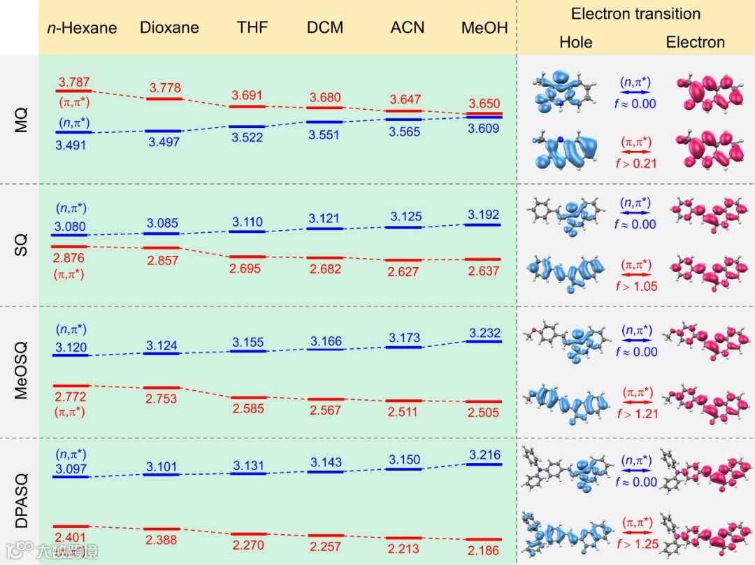 为了研究四个分子不同光物理性质背后的机制和邻近效应的影响,作者分别计算了它们在不同溶剂环境下(n, π*)和(π, π*)态的绝热能级和电子-空穴分布(图3)。通常,在含杂原子的化合物中,具有极小振子强度的(n, π*)跃迁被视为是淬灭发光的非辐射通道,而具有较大振子强度的(π, π*)跃迁则被认为是有效的辐射通道。结果表明,MQ中(n, π*)的能级均低于(π, π*)态,随着溶剂极性的增加,两个态之间的能差逐渐变小。因此,两个态之间的耦合作用和邻近效应逐渐增强,其有效地促使激子能够通过(π, π*)跃迁而增强发光。对于SQ,其(π, π*)态能级低于(n, π*)态并且两者间的能差随溶剂极性的增加而变大,两个态之间的耦合作用和邻近效应则逐渐减弱,(n, π*)跃迁对发光的淬灭作用减弱。因此,SQ的发光强度随着溶剂极性的增加而增强(图1)。对于具有强电子给体的 MeOSQ 和 DPASQ,在所有溶剂中(π, π*)态的能级始终低于(n, π*)态,并且在相同溶剂中DPASQ的能差比MeOSQ更大。理论上,这两个分子均不具有明显的邻近效应,它们的发光强度随着溶剂极性的增加而不产生明显变化。但是,除了邻近效应之外,在强D-A体系中的TICT则逐渐成为主导光物理性质的因素,其会导致分子的发光随溶剂极性的增加而红移减弱。因此,邻近效应、TICT和分子内运动受限的协同作用共同影响了MeOSQ和DPASQ在混合溶液中的发光变化。