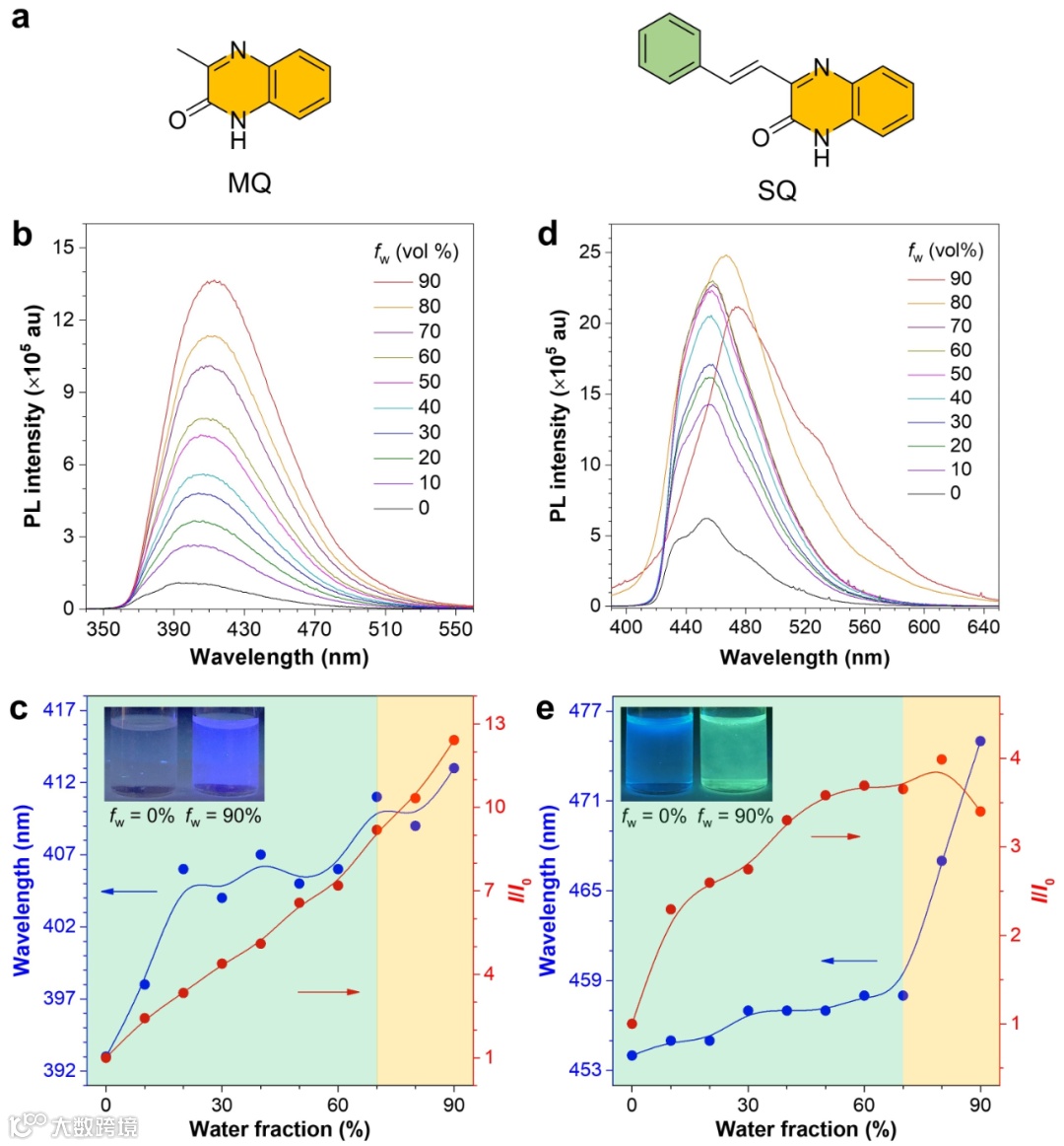 作者首先比较了四个分子在四氢呋喃/水的混合溶液中发光性质的变化。MQ在纯四氢呋喃溶液中几乎不发光,但随着水含量的增加其发光逐渐增强,波长也逐渐红移(图1)。当水含量为70%时,其发光强度较纯四氢呋喃溶液中增加9倍,最大发射波长从393 nm红移至410 nm;当水含量为90%时,其发光强度约增加13倍,波长进一步红移至413 nm。SQ的发光强度也表现出随着水含量的增加而逐渐增强的趋势,但是其在水含量为70%时发光强度增加约4倍。此外,其发光波长呈现出两个阶段的变化,即由于极性变化引起的缓慢红移(从454 nm到458 nm,水含量≤70%)和聚集体形成引起的快速红移(458 nm至475 nm,水含量>70%)。上述结果表明,弱供体(苯环)的引入不仅改变了其物理性质(溶解度、堆积结构等),而且也显著地影响了其电子结构和光物理性质。