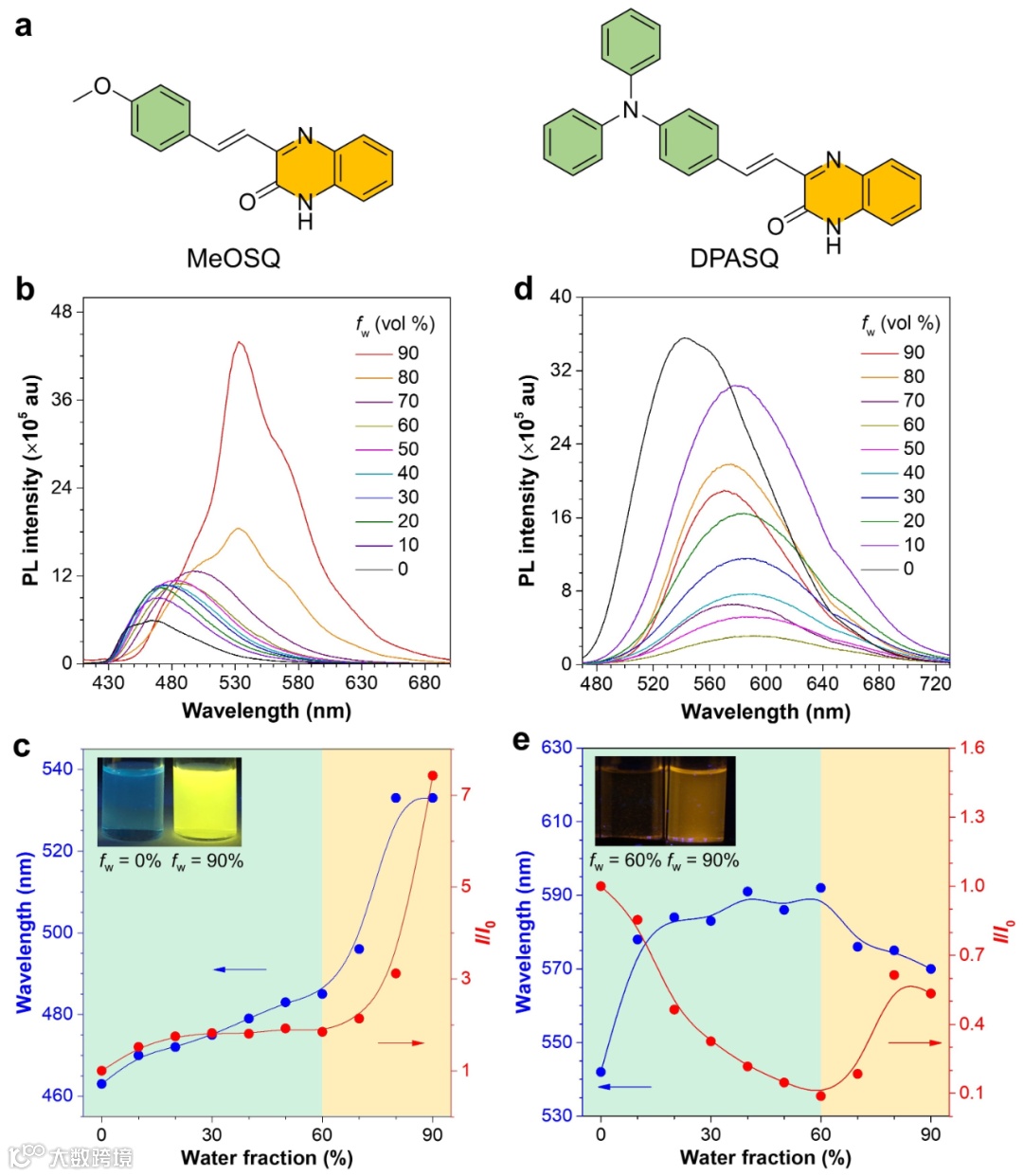 图2 MeOSQ和DPASQ分子在四氢呋喃/水的混合溶液中的荧光谱图及发射峰强度/波长的变化曲线