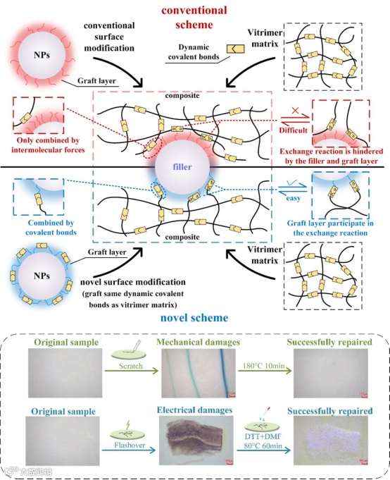 近年来,随着动态共价键技术的发展,可修复机械损伤的聚合物电介质材料已经成为现实。然而,关于高性能和可修复电损伤的高介电复合材料的相关研究仍鲜有报道。这主要是由于以下的技术瓶颈:(1)引入动态共价键可能导致材料性能下降,难以获得兼具高介电性能和可修复性的高介电复合材料;(2)不同于单一组分的热固性材料,高介电复合材料含有的较多填料限制了动态共价键的修复作用;(3)不同于机械损伤,电损伤往往破坏材料有机结构并生成残碳,其更难被传统的动态共价键交换修复。
