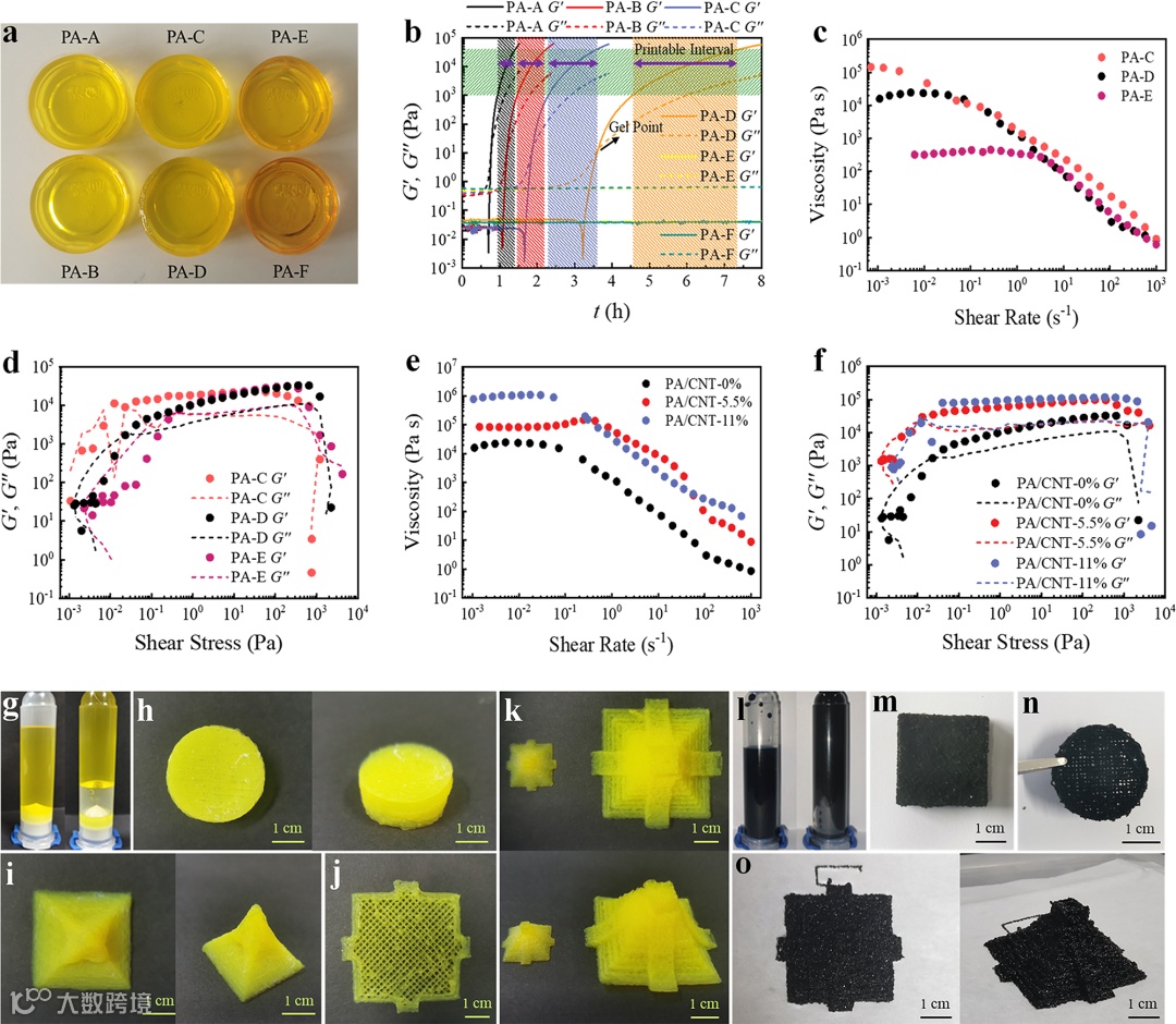 图2 聚酰亚胺气凝胶基墨水流变学及3D打印