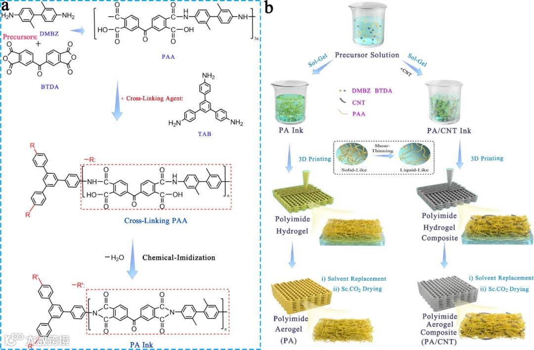 图1 聚酰亚胺气凝胶基墨水合成化学及3D打印路线