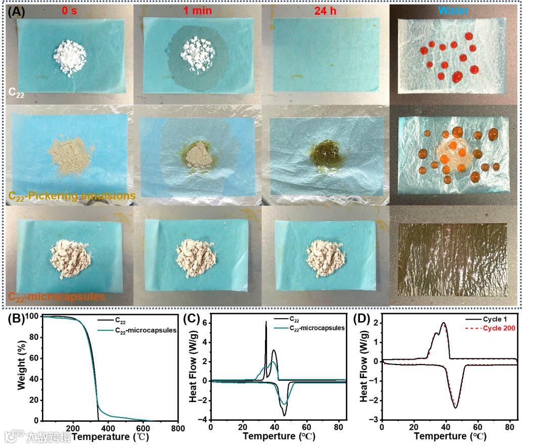 图6. (A) 100 °C时块状二十二烷(上)、二十二烷的Pickering乳液冻干粉末(中)和二十二烷微胶囊(下)的泄漏测试;(B)块状二十二烷和二十二烷微胶囊的TGA曲线;(C)块状二十二烷和二十二烷微胶囊的DSC曲线;(D) 二十二烷微胶囊在第一次(黑线)和第200次(红线)加热-冷却循环扫描时的DSC曲线。