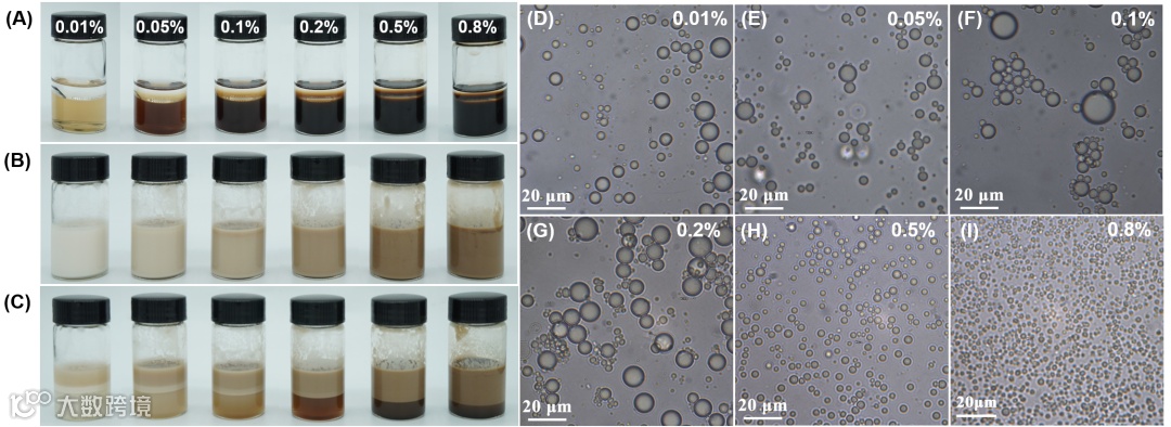 图3. 不同质量分数的LCNP分散液的乳化效果对比(以C14为油相),乳化前(A),乳化后(B)和乳化后静置12小时;不同浓度下乳液的光学显微镜照片(D-I)。