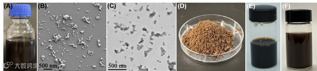 图1. LCNP水分散液(A),LCNP的SEM(B)和TEM(C)图,冻干的LCNP粉末(D),LCNP粉末的水再分散液(E)和乙醇再分散液(F)