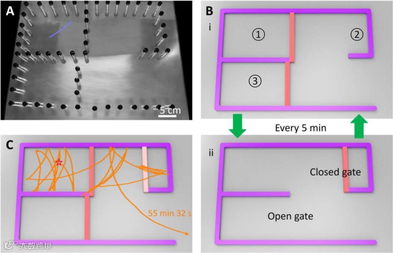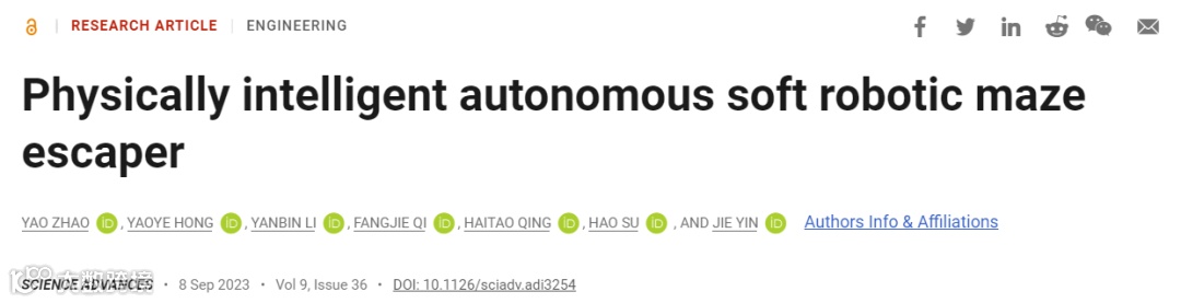 自主逃离迷宫对于软体机器人来说是一个有趣且非常有挑战性的课题。迷宫通常用来衡量与测试机器人对周围环境的处理、计算以及应变能力,一定程度上反应了机器人的智能水平,从而用于探索未知的复杂环境。挑战性在于软体机器人通常需要在其柔软身体上集成动力、传感器和控制等硬件来实现类似人脑的决策以及执行功能。目前软体机器人逃离迷宫往往是通过两种途径来完成:一种是通过人为操作机器人逃离,比如通过远程控制外加磁场或者光源,可以实现无牵引软机器人,但无法让软机器人自我决定运动路径,从而缺乏智能。另一种则是通过机载的电源和控制器来完成。这种方式也有弊端,比如结构以及控制复杂,无法自主求解复杂迷宫等等。