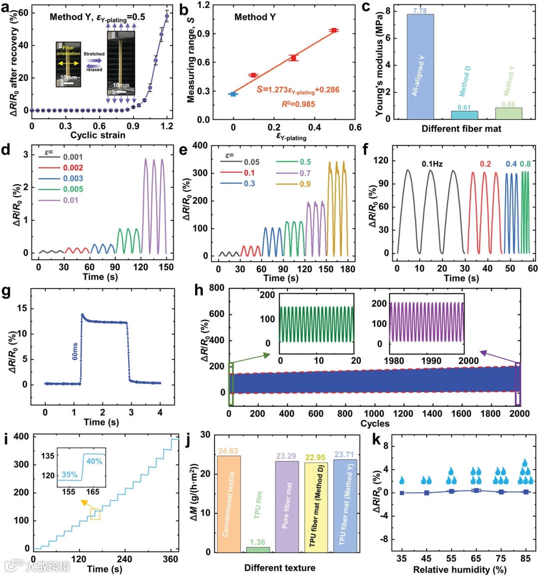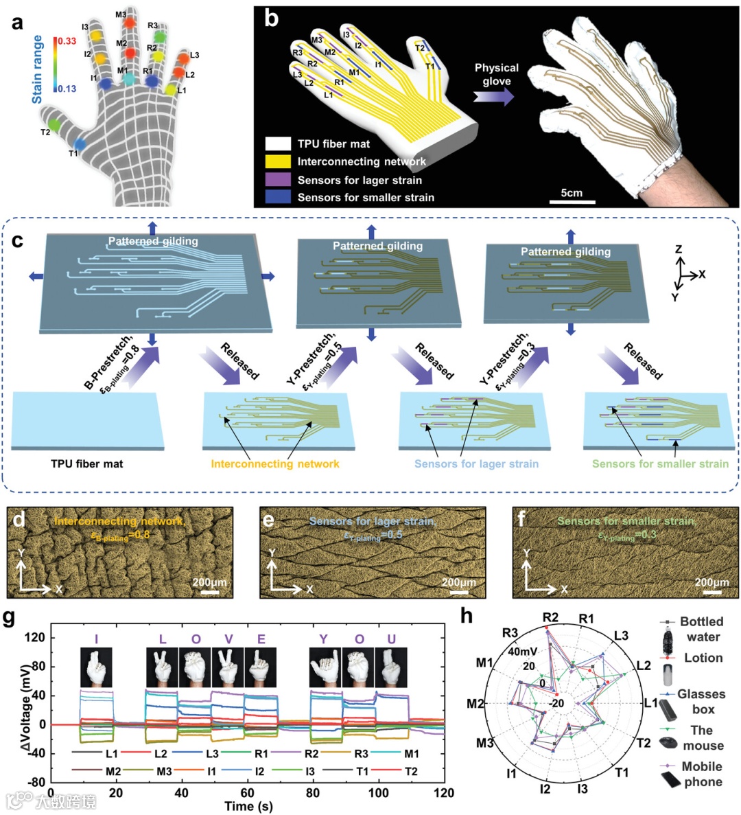 该工作为织物应变传感器的按需设计开发了一种机械策略,以便传感器的响应(即测量范围和灵敏度)可以在制造过程中进行调节。该工艺将TPU纤维垫的表面的纤维层以预拉伸状态镀上金层,从而能够以设计的方式保持纤维方向。与传统的更换材料体系或调整整体纤维方向的策略相比,该策略可以调节单个衬底上多个传感器的响应,对其力学性能的影响很小。详细的力学分析阐明了其机理和关键因素的影响,可为复杂传感系统的研究提供指导。运动监测绷带和手势识别手套中的设备演示展示了出色的机械灵活性和调节多个传感器响应的能力。所提出的响应调节策略在各种织物传感器中具有普遍的适用性,因此在表皮电子器件的设计和制造中具有广阔的应用前景。