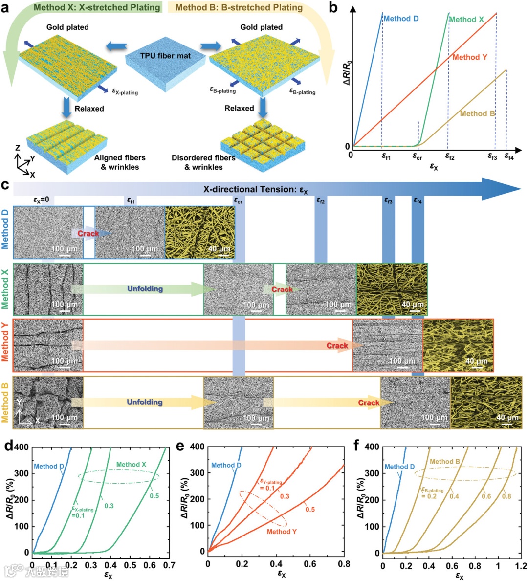 本文提出了一种机械引导的设计和制造策略,用于在无序排列的纤维垫的顶表面上引入具有规定的纤维排列的电活性材料(例如金)。该策略通过在预拉伸状态下沉积而不是传统策略中采用的无负载状态来形成表面电活性材料层。沉积电活性层后释放预拉伸即完成了该过程。该策略适用于多种纤维毡材料,在这项工作中使用了具备良好拉伸能力的热塑性聚氨酯(TPU,法国路博润的Tecoflex SG-80A)。这种方式仅对很薄厚度范围内的表面层纤维有效,镀金的表层纤维保持预拉伸状态下排列程度,该薄表面层通常低于10μm,比整体厚度(≈50-300μm)薄得多,而不会影响其余无序部分。因此,可以通过这种简单的机械策略制造具有调节测量范围和灵敏度的织物应变传感器。具体来说,测量范围(线性度为 R2>0.978)可以从0.25(无序纤维排列)和0.9(沿载荷方向预应变0.5)调节,能够准确捕获指关节的最小应变及肩部大应变等部位的需求。通过综合的实验揭示了该策略的底层机理,理论分析总结了按需调控传感器设计的关键因素。将所提出的策略与传统预拉伸策略结合能够实现传感导电网络的按需制备,系统的实验总结了调控规律,为单一电活性材料及单一衬底材料的传感导电网络的制备提供了指导方案。