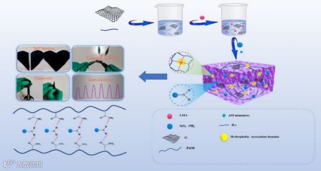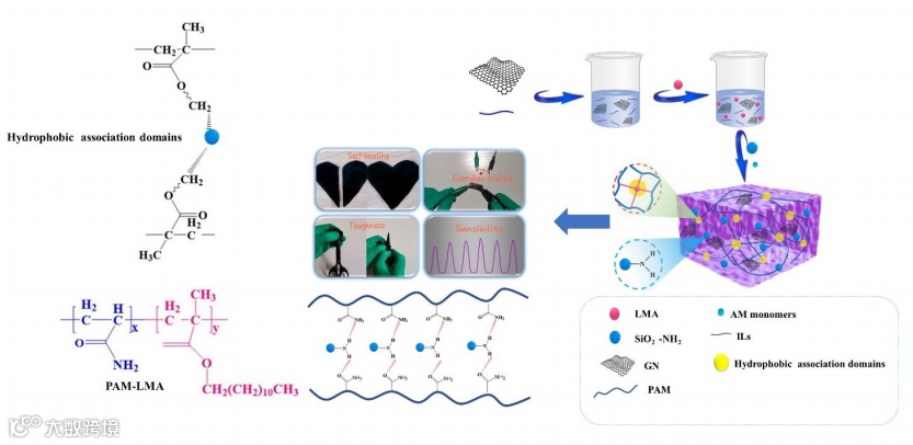 图1. PAM@SiO2-NH2/(ILs-GN)水凝胶的合成示意图