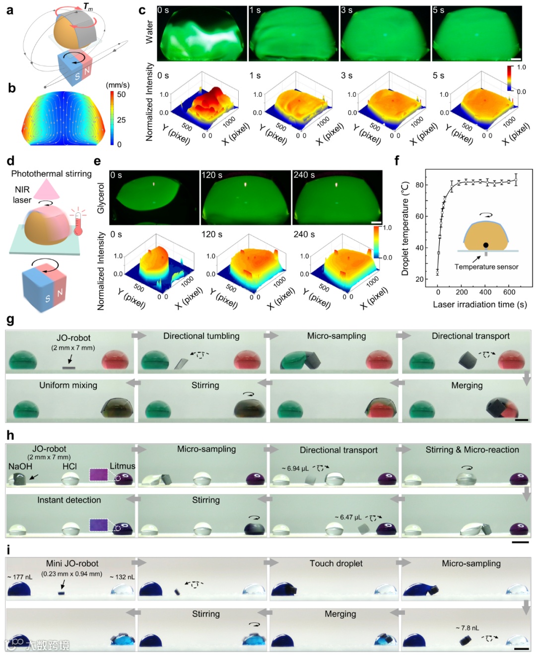 图2. 基于磁响应双面神折纸机器人的液滴搅拌、光热搅拌以及多功能液滴操纵集成。