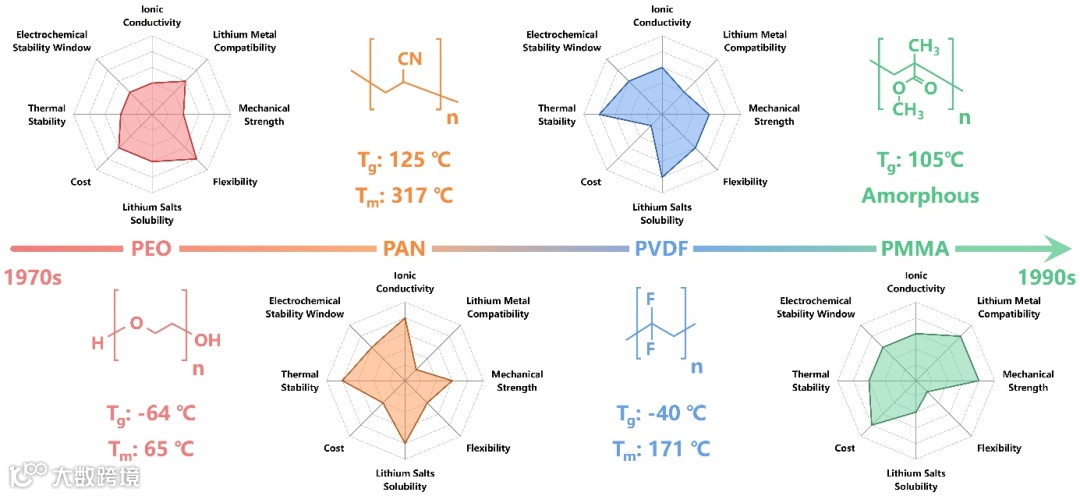 经过数十年的发展,聚环氧乙烷(PEO)、聚丙烯腈(PAN)、聚偏二氟乙烯(PVDF)和聚甲基丙烯酸甲酯(PMMA)已成为聚合物固态电解质中使用最广泛的聚合物基体材料。它们各自的结构及特性如图3所示。针对它们的缺点,文中还总结了许多典型的改性策略。