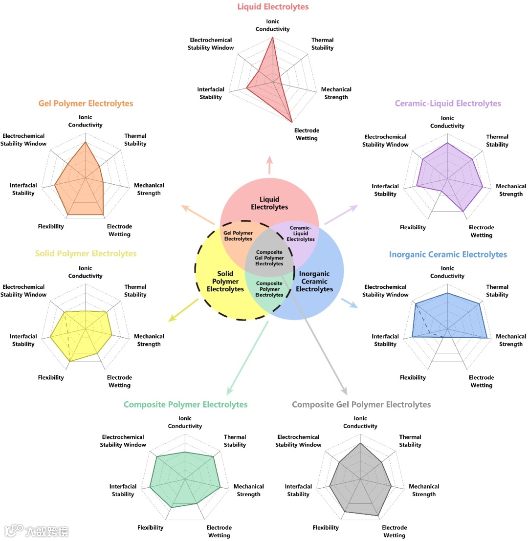 锂电池电解质大体可分为液态电解液(Liquid Electrolytes,Les)和固态电解质(Solid-State Electrolytes,SSEs)两大类,其中固态电解质包括固态聚合物电解质(Solid Polymer Electrolytes,SPEs)和无机陶瓷电解质(Inorganic Ceramic Electrolytes,ICEs)。它们有各自显著的优缺点。为了进一步提高电解质的综合性能,常常将它们组合,而形成复合电解质,如图2所示。其中,基于聚合物的固态电解质(虚线标注)拥有最综合的各项性质,最适于高比能固态电池的构建。