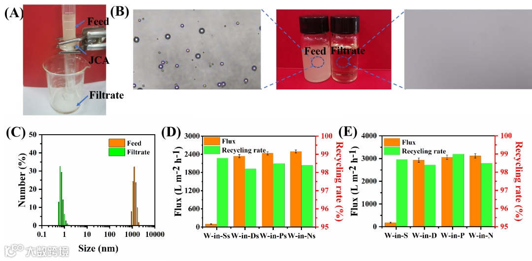 图5 水/油乳化分离设备示意图(A);大豆油包水乳液(W-in-Ss)照片及光学显微图像(B);W-in-Ss乳液过滤前后的液滴粒径分布(C);表面活性剂稳定的油包水乳状液(D)和无表面活性剂的油包水乳状液(E)的渗透通量和油相回收率。