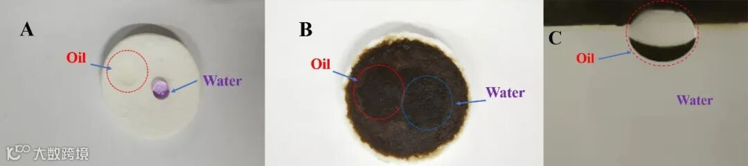 图3 JCA的不对称润湿性。未改性表面(A);PDA涂层表面(B);水下的PDA涂层表面(C)。
