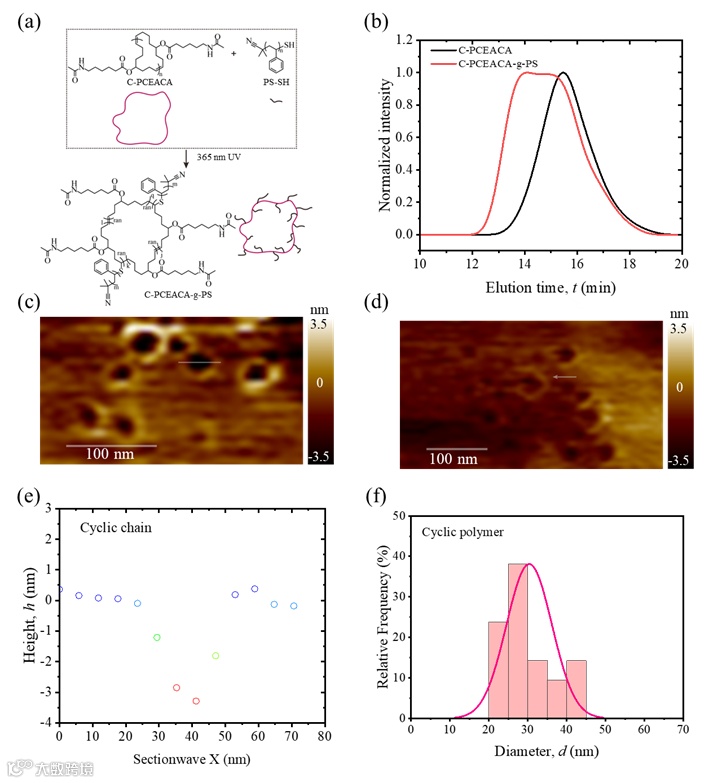 图3.(a)PS-SH接枝C-PCEACA合成C-PCEACA-g-PS的示意图;(b)C-PCEACA和C-PCEACA-g-PS的凝胶色谱曲线;(c,d)原子力显微镜下环形刷状高分子链(c)和线形刷状高分子(箭头方向)(d)的高度图;(e)单个环形刷状高分子链的高度分析;(f)C-PCEACA-g-PS高分子链的直径统计分析。