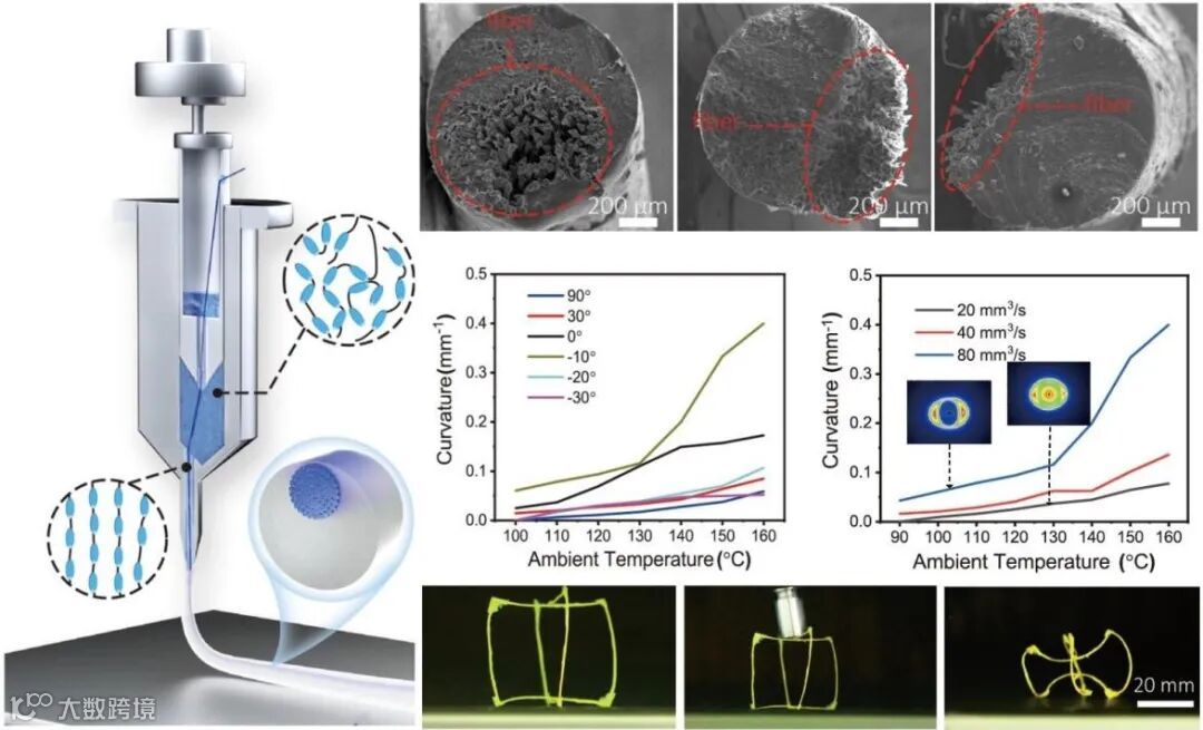 西安交通大学科研团队利用液晶弹性体的可逆热致伸缩变形能力,结合连续纤维材料的优异力学性能,提出一种基于连续纤维增强液晶弹性体的直写4D打印方法,液晶弹性体复合材料内部嵌入的连续纤维起到了显著增强力学性能以及实现弯曲变形效果的作用。该打印方法能够通过调控纤维在复合材料丝材内部的偏置位置实现打印结构可控的承载特性及变形形态。打印的液晶复合材料可以承受高达其自身重量2805倍的载荷,并在150 ℃条件下实现0.33 mm-1的弯曲曲率。利用这一工艺制备了具有承载能力以及变形能力的复合材料桁架结构,解决了传统4D打印结构力学承载性能差的难题。研究成果以《具有可编程空间变形能力的可控偏置连续纤维/液晶弹性体复合材料4D打印》(Programmable Spatial Deformation by Controllable Off-center Freestanding 4D Printing of Continuous Fiber Reinforced Liquid Crystal Elastomer Composites)为题发表在期刊《自然通讯》(Nature Communications)上,论文第一作者是西安交通大学博士生王清瑞,田小永教授为唯一通讯作者,论文作者还有李涤尘教授、博士生张道康、硕士生周艳丽,西安交通大学为唯一完成单位。