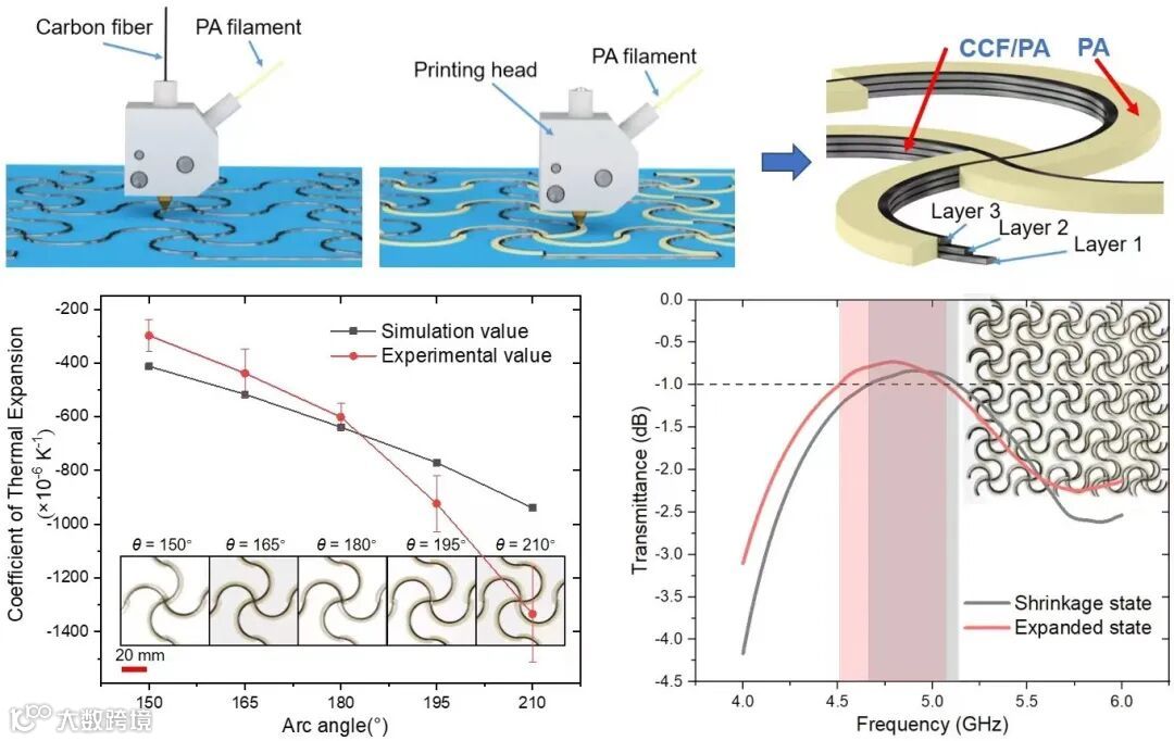 连续碳纤维具有良好的导电导热性能和极低的热膨胀系数,研究团队利用与其树脂基体的热膨胀系数差异明显,提出了一种基于连续碳纤维的热变形可调谐超表面的设计与4D打印方法,通过连续纤维复合材料手性结构设计,将复合材料和热塑性树脂分区沉积成形,基于理论计算、有限元分析和实验揭示了结构参数对热变形和电磁频率控制的影响规律。所制备超表面结构的最大热膨胀系数测量值达到了1333×10-6K-1,实现了等效热变形前后的超表面对-1 dB电磁波透射频段28.1%的偏移,该方法为空间天线结构在轨电磁性能调控提供了一个新思路。研究成果以《4D打印连续纤维热控超表面》(4D printed thermally tunable metasurface with continuous carbon fiber)为题发表在《虚拟与物理原型》(Virtual and Physical Prototyping)上,论文第一作者是西安交通大学博士生康友伟,田小永教授为唯一通讯作者,论文作者还有西安交通大学李涤尘教授、吴玲玲副教授,航天五院西安分院马小飞研究员等。