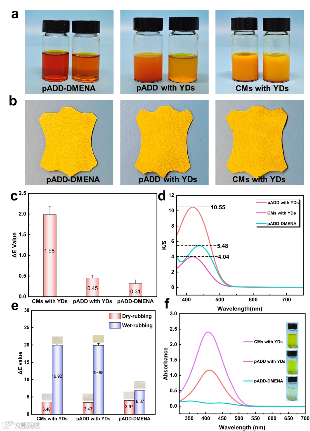 传统的制革湿整饰工艺繁琐,添加的化学助剂种类多、用量大,限制了制革工业向节能减排方向发展。结合有机无铬鞣制体系的快速推广,两性湿整饰材料在解决当前化学吸收率低等问题方面显示出了巨大的前景。基于此,他们设计合成一种多功能荧光两性聚合物(简称pADD-DMENA),并提出了生态有机无铬皮革制造的颠覆性“三位一体”工艺策略。pADD-DMENA表现出优异的复鞣、加脂和染色“三位一体”功能,柔软度为8.5 mm,增厚率为40%,抗张强度为19.77 MPa,撕裂强度为59.40 N/mm。且与传统阴离子染色皮革相比,pADD-DMENA染色皮革表面呈现均匀的亮黄色,并且具有优异的耐光性、耐久性和耐洗性。此外,其荧光本体能够对坯革和污水中的pADD-DMENA进行视觉跟踪,从而可以实时监测pADD-DMENA的精确分布。综上所述,pADD-DMENA的开发可以一步完成传统的湿整理工艺,有效节省工艺时间,减少各种化学品的添加11.2%,并表现出更好的废水降解性(BOD5/COD为0.35)。这一创新策略为生态皮革制造向低能耗、少污染的绿色方向拓宽了道路。