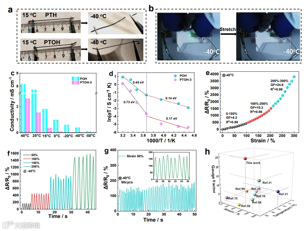 对其进行-40oC超低温下性能测试可看到PTOH纤维不仅具有良好的机械性能和离子导电性,其传感性能更为突出。其原因是零度以下温度范围内质子迁移的活化能小于0.4 eV,是典型的Grotthuss机制,质子通过H…O, N…H氢键以及H-O和N-H共价键的键振动进行跳跃传递。在拉伸过程中,由于TANI刚性链和PVA柔性链的差异,TANI、EG和PVA之间动态氢键(作为质子迁移的通道)易断裂,因此导致低温下的应变系数增加。