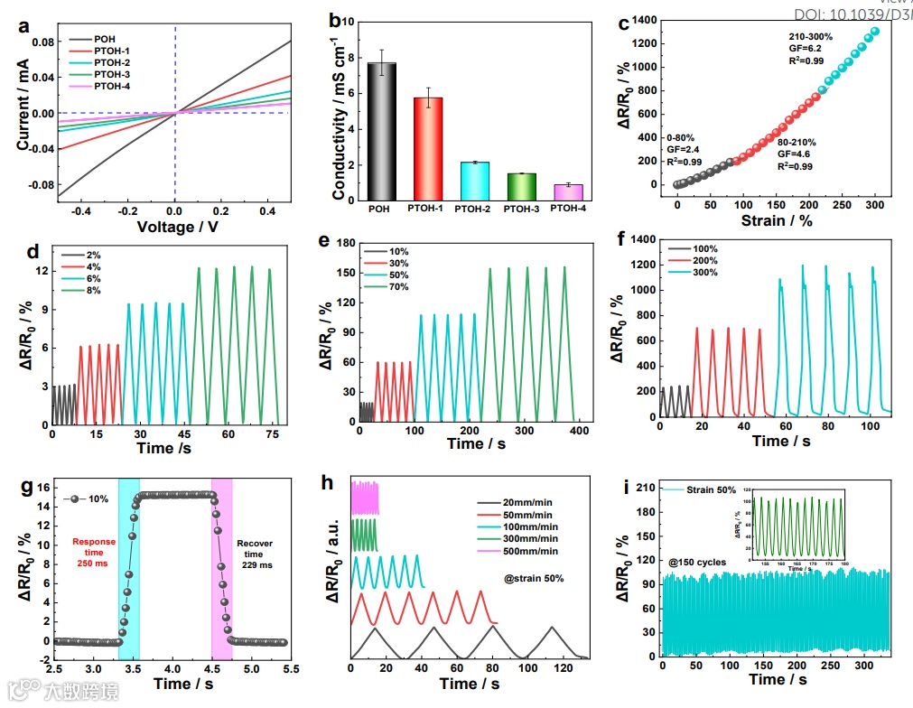 研究人员通过对含不同TANI浓度的有机水凝胶纤维进行电导率测试与传感性能测试,发现电导率随TANI含量的增加而下降,说明TANI起到了捕获质子作用。在室温下可以看到PTOH水凝胶纤维具有优异的传感性能,应变从2%到300%电阻信号呈线性变化,且具有快速响应性和耐用性。