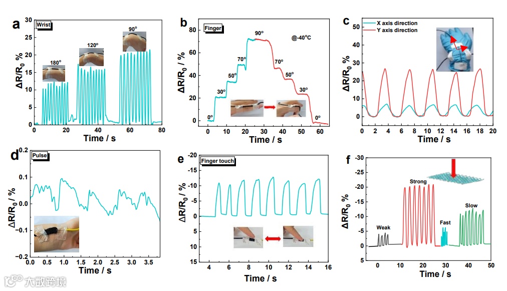 对PTOH纤维进行人体运动实时监测,如手指、手腕和脉搏等。均可观察到明显且稳定的电阻变化,甚至是-40 oC下。并且不同方向输出信号的显著差异表明了纤维在检测各个方向应变方面的独特能力。将纤维编织成纺织品后,所制备的应变传感器也可对脉冲跳动进行监测。