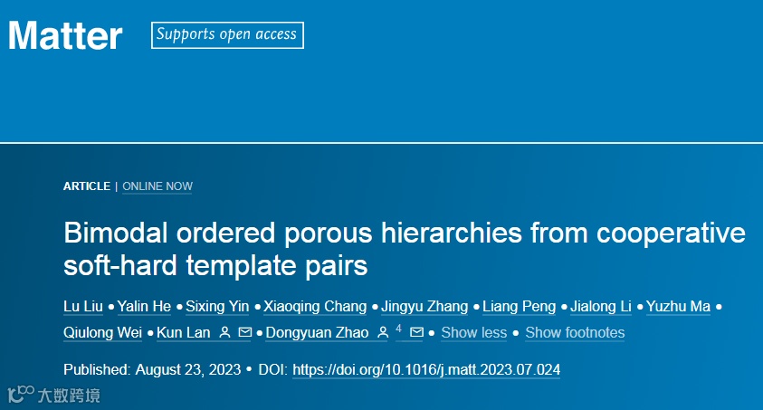 2023年8月23日,复旦大学/内蒙古大学赵东元院士团队在Matter期刊上发表了题为“Bimodal ordered porous hierarchies from cooperative soft-hard template pairs”的研究成果。