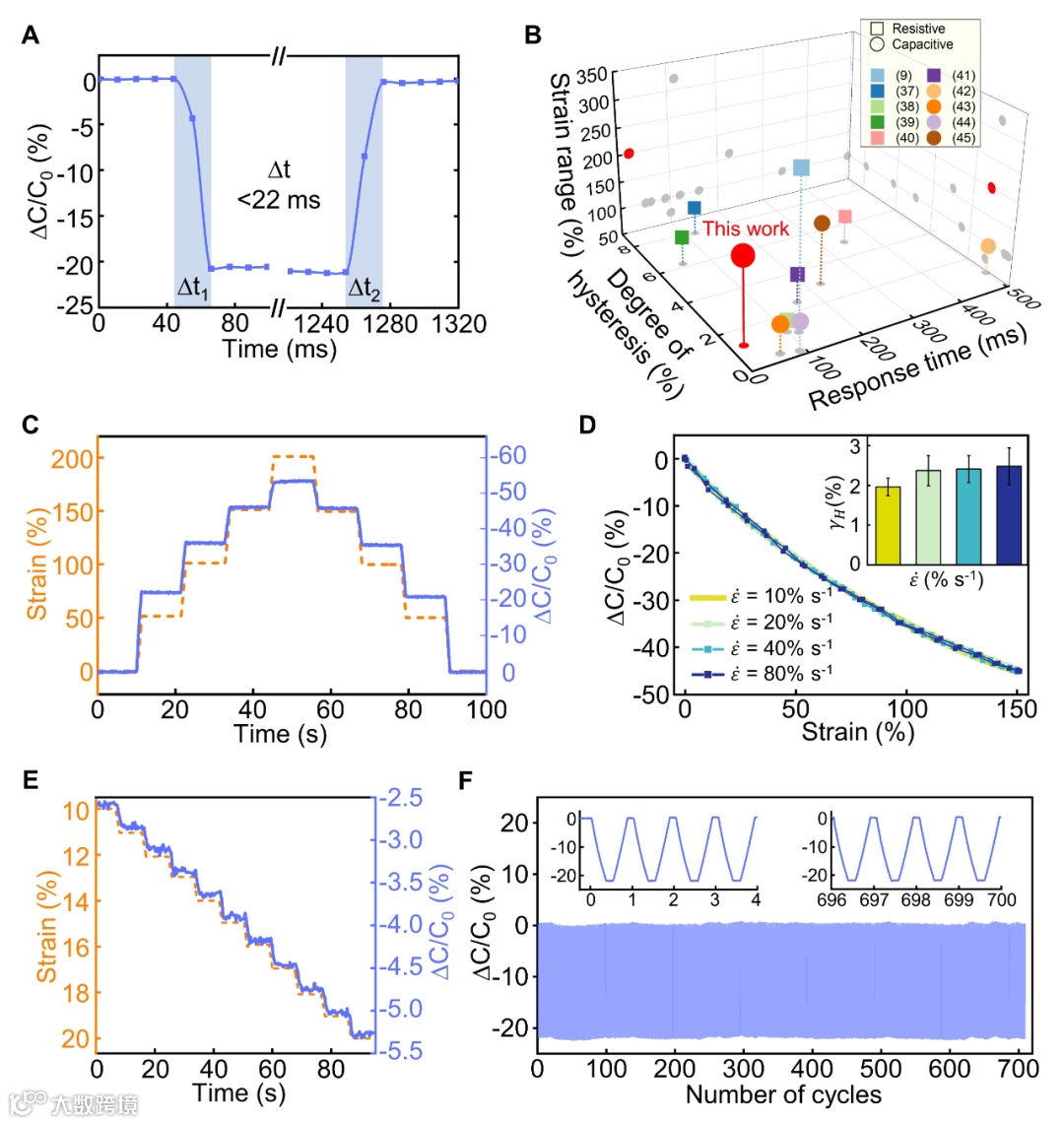图4 传感器性能的表征包括响应和恢复时间、应变速率、应变分辨率以及传感器的重复性能。