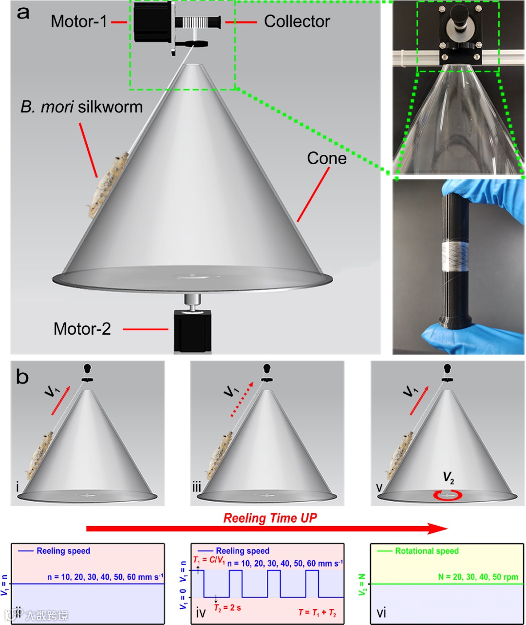 随着蚕丝材料在生物工程、柔性传感器、光学存储、柔性电子器件和软质致动器等方面的应用被逐渐开发,人们逐渐意识到蚕丝不仅仅是一个中华文明的符号,也不仅仅是一个奢侈品服装面料的代名词,其在高新技术领域也有一席之地。然而,天然蚕丝在形态、结构和性能上的差异性,极大地限制了这些高新技术的产业化进程。因此,科学家一直在探寻形貌更规整,性能更优良的蚕丝材料。目前,人工强制抽丝技术已被证明是获得高性能蚕丝的理想方法。然而,被迫改变吐丝行为后的桑蚕在强制抽丝时表现出剧烈的抵抗行为,抽丝速度难以提高、效率低,容易造成断丝且蚕丝与蚕丝之间性能差异较大。因此,如何缓解或消除抽丝过程中桑蚕的抵抗行为并获得性能优良的蚕丝仍是一个巨大的挑战。