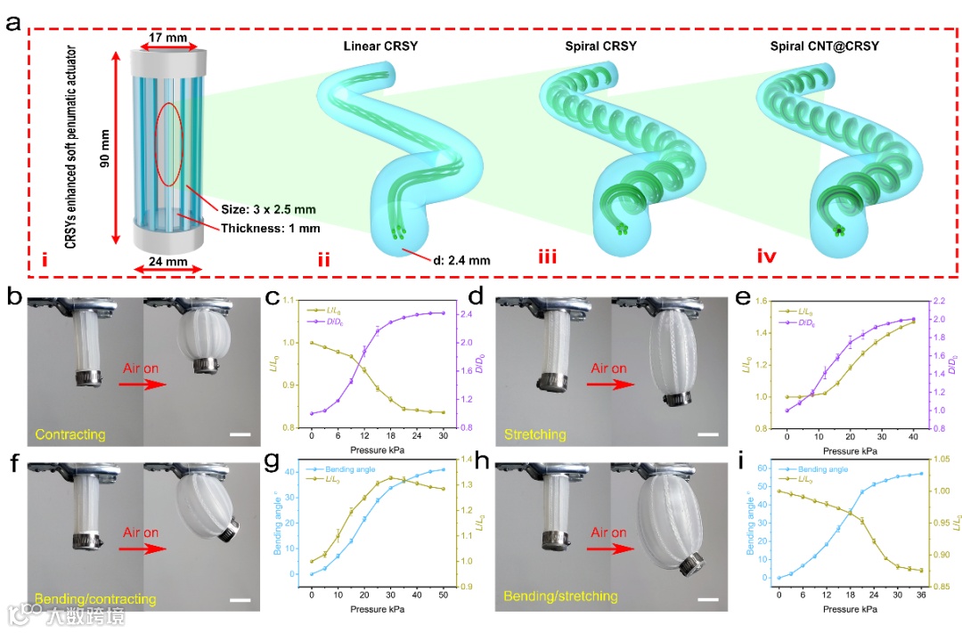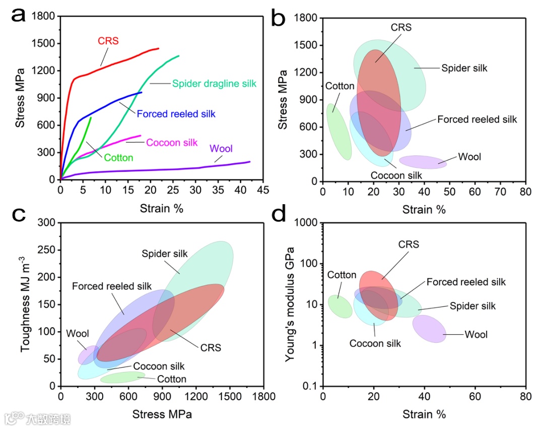 近期,浙江理工大学杨斌教授课题组基于一种多模式、快速离心抽丝策略,制备出了高强、高模、高韧蚕丝(CRS)。受蜘蛛及蓑蛾等悬空吐丝行为的启发,该团队利用具有不同角度的圆锥斜面使吐丝桑蚕获得近似悬空状态并进行抽丝;同时利用桑蚕在结茧过程中的间歇吐丝现象,进行间断抽丝,即连续抽取一定时间后,停止抽丝操作,使桑蚕得到充足的时间以适应人工抽丝过程;最后通过转动圆锥载体和增加吐丝桑蚕的数量以同步制备高强蚕丝纱线(CRSY)。该策略获得的CRS的断裂强度高达1.45 GPa,是天然蚕丝的三倍,完全媲美蜘蛛丝;其韧度为121.07±35.31 MJ m-3,杨氏模量为27.72±12.61 GPa。这是迄今为止报道的力学性能最好的桑蚕丝材料之一。同时,CRS还具有快速扭转恢复性能,且多次循环后仍能保持良好的恢复效果,是优秀的微致动器材料。此外,基于CRSY的气动软质致动器可执行预设动作,包括:收缩、伸长和弯曲,且能够承担极高的载荷,充分展示了CRSY在人工肌肉、软质致动器及软体机器人领域的应用潜力。有趣的是,已有报道指出天然蛋白质纤维在低温环境(液氮)中仍能保持良好的力学特性,结合该工作中CRS的高强高模高韧特征,其有望在充满未知物体撞击的深海或太空环境中实现软体机器人的信号传递和任务执行。总之,这种多模式的快速离心抽丝策略开辟了一种全新的高性能蚕丝生产方法,为大规模、连续化制备高性能动物丝材料(柞蚕、蜘蛛及蓑蛾等)提供了有力支持。