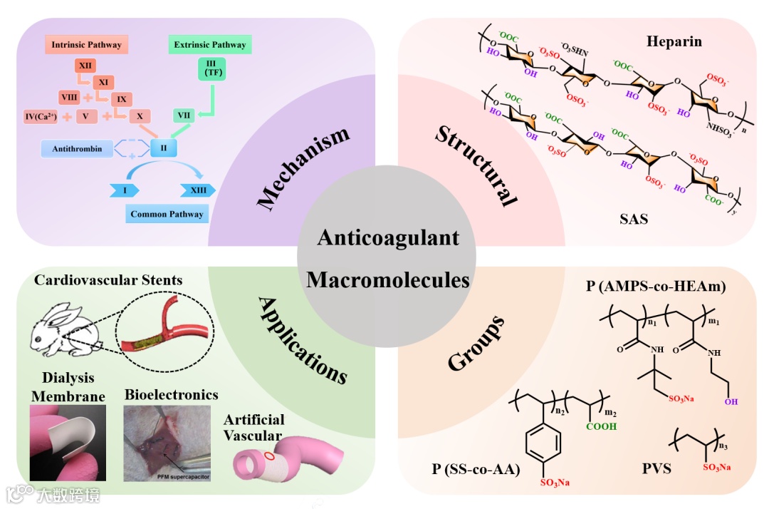 iii) 探究大分子结构与抗凝血活性的关系。分子结构、分子链的长度、磺酸化程度、空间构象等直接影响其与凝血因子的亲和力和抗凝活性。这些结构与性能之间的关系可以通过计算模拟和实验研究相结合的方式进一步探索,获得更优化的抗凝血大分子。