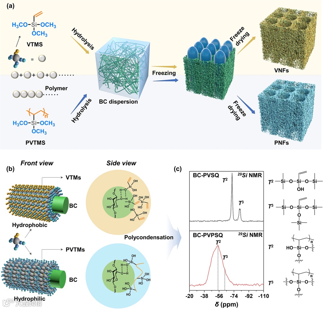 杂化纤维气凝胶的制备流程如图1所示。聚合前后的乙烯基三甲氧基硅烷通过水解分别转化为硅溶胶,加入纤维素分散液后通过定向冷冻及干燥,获得具有超疏水或超亲水的纤维气凝胶。润湿性差异来源于聚硅氧烷在纤维素表面不同的组装结构。