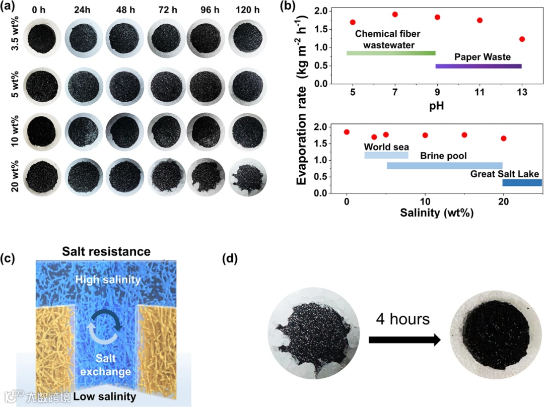 图7. 双层蒸发器耐盐性能 (a)蒸发器120小时连续耐盐实验;(b) 在极端pH值和高盐度下的蒸发性能测试;(c)蒸发器耐盐-盐扩散工作机制;(d)无光照条件下,蒸发器表面自清洁特性。
