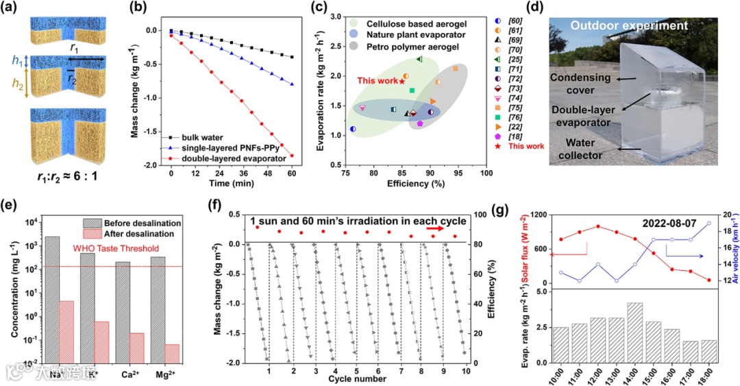 图6. 高性能界面蒸发 (a)双层蒸发器示意图;(b)在1个太阳光下,海水、单层PNFs-PPy和双层蒸发器作用下,水蒸发质量随时间的变化;(c)双层气凝胶蒸发器蒸发速率和效率对比;(d)户外蒸发装置照片;(e)蒸发前后的水中四种主要离子的浓度变化情况;(f)蒸发器的循环稳定性验证;(g)室外界面蒸发测试。