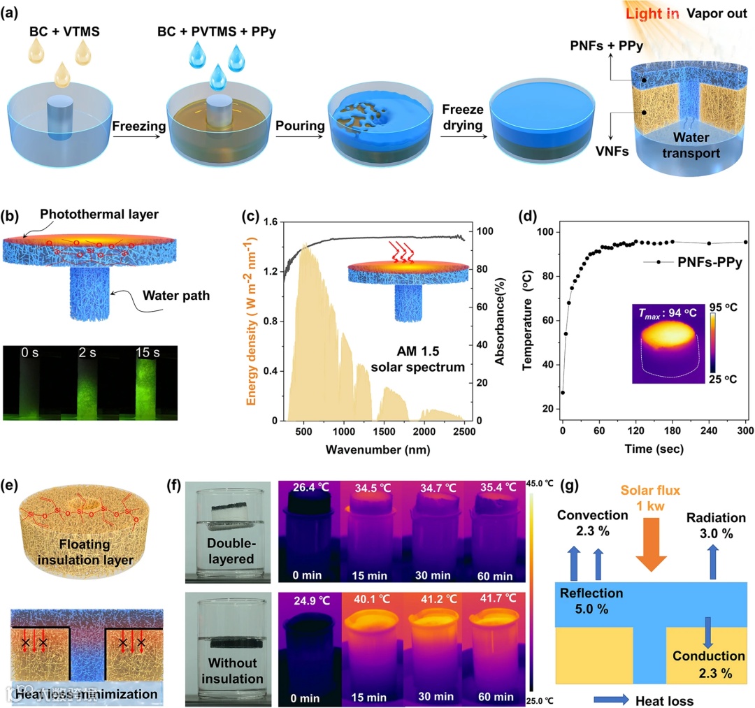 图4. 太阳能驱动的界面蒸发双层气凝胶 (a) 双层气凝胶制备流程图;(b)(上)伞状PNFs-PPy的示意图,(下)PNFs的快速水输运性质;(c-d) PNFs-PPy 吸收光谱及热红外成像照片;(e) VNFs多孔隔热层的示意图;(f) 双层蒸发器和单层PNFs-PPy在一个太阳光下照射60分钟的热红外成像照片;(g) 蒸发器的热损失图。