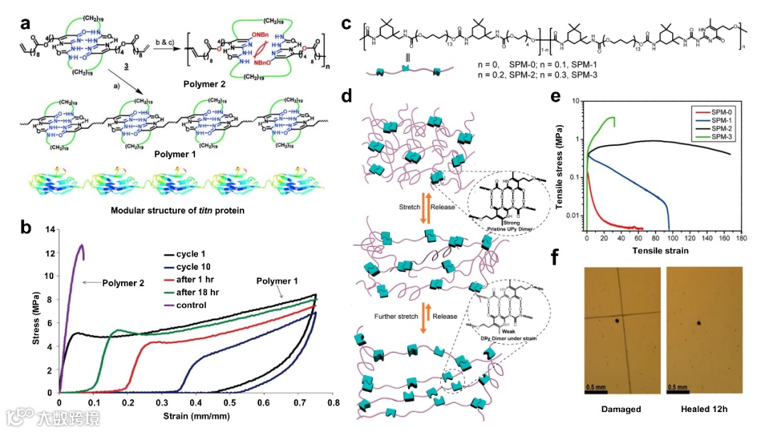 通过化学反应在聚合物结构中引入氢键交联基序是制备自愈聚合物最常用的策略之一。目前,聚合物内部结构中的氢键交联可以通过特定的氢键交联基序或链间多个氢键相互作用的自共轭,以及外部交联剂的加入来实现。在本节中,他们主要介绍通过引入特定的氢键交联基序来制备基于氢键的自愈聚合物。这些基序的多重氢键通常包括三重氢键、四重氢键和六重氢键。其中,具有自互补四重氢键的UPy单元已被证明是最有希望构建动态聚合物和生物材料的基序之一,因为它们具有中等的缔合-解离常数。因此,迄今为止,通过将UPy单元与聚合物主链(图2)、侧链(图3)和链端(图4)进行化学键合,获得了许多具有理想机械性能的自愈聚合物。
