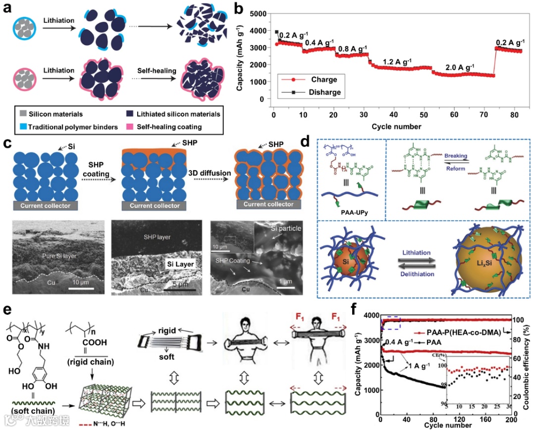 自愈聚合物具有自愈、机械柔韧性和轻量化等固有优点,作为能源器件和柔性电子器件的活性材料,受到学术界和工业界的广泛关注。这些材料的创新使各种类型的自愈电子器件得以迅速发展。迄今为止,科学家们已经投入了巨大的努力,将自修复功能(用于修复机械完整性和恢复其功能和设备性能)集成到柔性电子产品中,以显着提高耐用性并延长这些设备的使用寿命,从而降低经济成本和电子浪费。得益于其突出的自愈性和机械坚固性,氢键交联自愈聚合物已被广泛用作各种能源和电子设备中的自愈材料。在本节中,主要将自愈装置根据其不同的功能分为三类来总结讨论,包括能量收集装置(图7),能量储存装置(图8)和柔性传感装置(图9)。