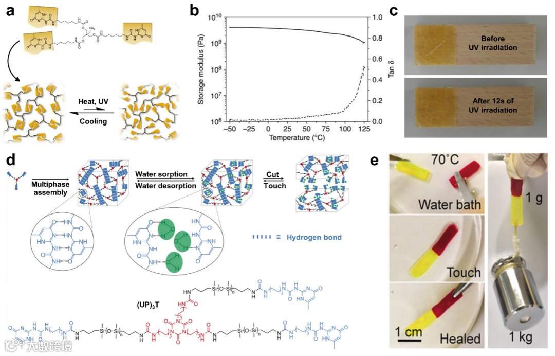 除自互补UPy单元外,目前,通过化学反应结合氢键簇是制备基于氢键的自修复聚合物的另一个重要策略。与上述讨论的由大分子组成的UPy功能化交联自修复聚合物不同,这些系统由具有各种缔合基团的低聚物混合物组成,这使得通过过量的氢键形成氢键簇网络。例如,当低分子量聚合物通过密集的氢键交联时,也可以生产出机械坚固且易于修复的材料。到目前为止,大多数带有氢键团簇的交联聚合物都是通过微相分离(图5)或均相方法(图6)进行设计。