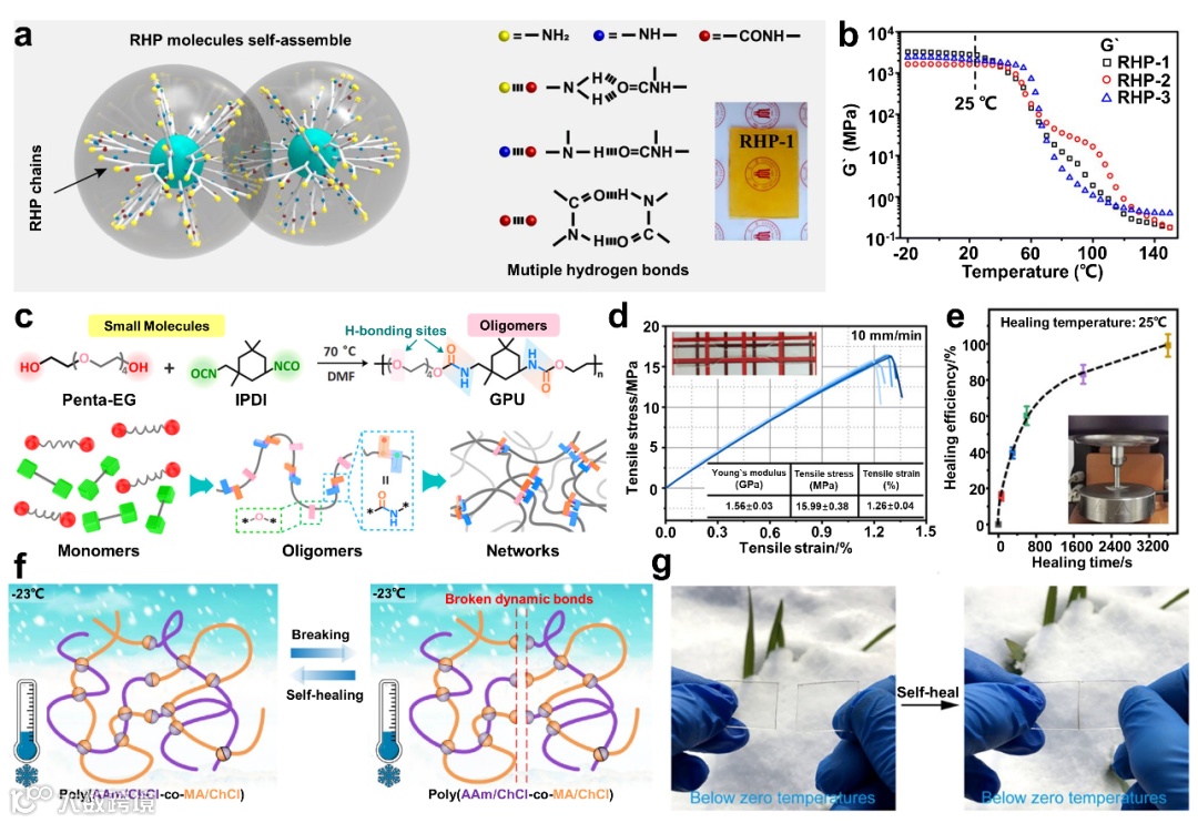 合成聚合物自20世纪初商业化以来,已成为现代工程材料的重要组成部分。在过去的几十年里,高性能聚合物复合材料以其理想的力学性能、韧性和热稳定性被广泛应用于航空航天工程、智能电子、智能建筑和其他高科技领域。近年来,能够反复自愈物理损伤并恢复机械性能的聚合物引起了广泛关注。根据自我修复机制,自愈聚合物可分为外在修复型和本征修复型。外在自愈聚合物依赖于聚合物基质中的预嵌入微胶囊/纳米胶囊或血管网络,这些微胶囊/纳米胶囊或血管网络只允许聚合物进行有限次数的修复。更重要的是,由于聚合物基质和修复剂之间的内在差异,外在自修复聚合物不能解决结构损伤导致的功能退化。相比之下,基于动态共价键自组装策略或超分子动态化学的本征自愈聚合物引起了相当大的关注,因为它们不仅避免了修复剂复杂的整合和相容性考虑,而且还提供了可重复的自修复。在各种超分子化学中,具有可逆性、方向性和高单位体积浓度的氢键已成为自愈合聚合物最具吸引力的发展方向之一。在此,南京林业大学化学工程学院中比先进生物医用材料国际联合实验室黄超伯教授和熊燃华教授团队在《Materials Horizons》上发表了题为“Self-healing polymers through hydrogen-bond cross-linking: synthesis and electronic applications”的综述文章,回顾了基于不同氢键类型设计高性能自愈聚合物的最新进展,讨论了氢键基自愈聚合物结构设计对其机械性能和愈合效率的影响,总结了如何利用基于氢键的自愈聚合物制备可自愈的智能电子器件(包括能量收集器件、储能器件和柔性传感器件)(图1)。南京林业大学化学工程学院黄超伯教授、熊燃华教授以及青年教师朱苗苗为论文的通讯作者。该研究得到了国家自然科学基金、江苏省自然科学基金和江苏省研究生科研实践创新等项目的资助。