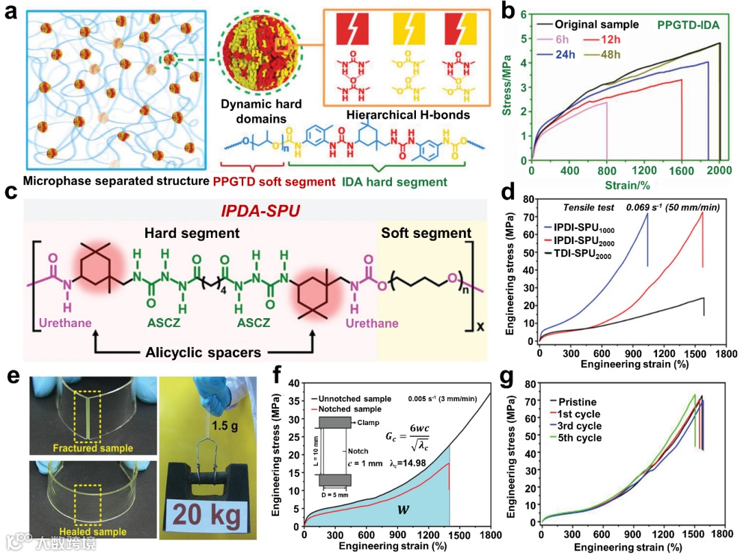 很明显,在过去的几十年里,人们对基于氢键的自愈聚合物进行了越来越多的研究。然而,这一领域还远未成熟。首先,这些聚合物通常需要复杂的合成途径,部分涉及大量的有机溶剂,这不仅限制了它们的可扩展制备,而且对未来的全球环境可持续性造成不可逆转的损害。因此,未来应进一步探索使用绿色、生物友好型材料和简单合成工艺的自愈聚合物。其次,基于氢键的自愈聚合物的另一个缺点是氢键容易受到水分子的影响,导致机械强度逐渐下降,甚至在高湿条件下失去自愈能力。因此,设计和开发可逆的、坚固的键合水下自愈聚合物,以及如何在自愈聚合物中引入键合仍然是一个长期的问题。第三,目前许多研究只关注自愈聚合物的合成及其自愈性能的表征,只有少数研究试图推导出氢键簇分布/拓扑与力学/自愈性能之间的一致和定量关系。因此,迫切需要更深入地了解自愈聚合物的结构-性能关系,以探索更先进的“智能”自愈聚合物。