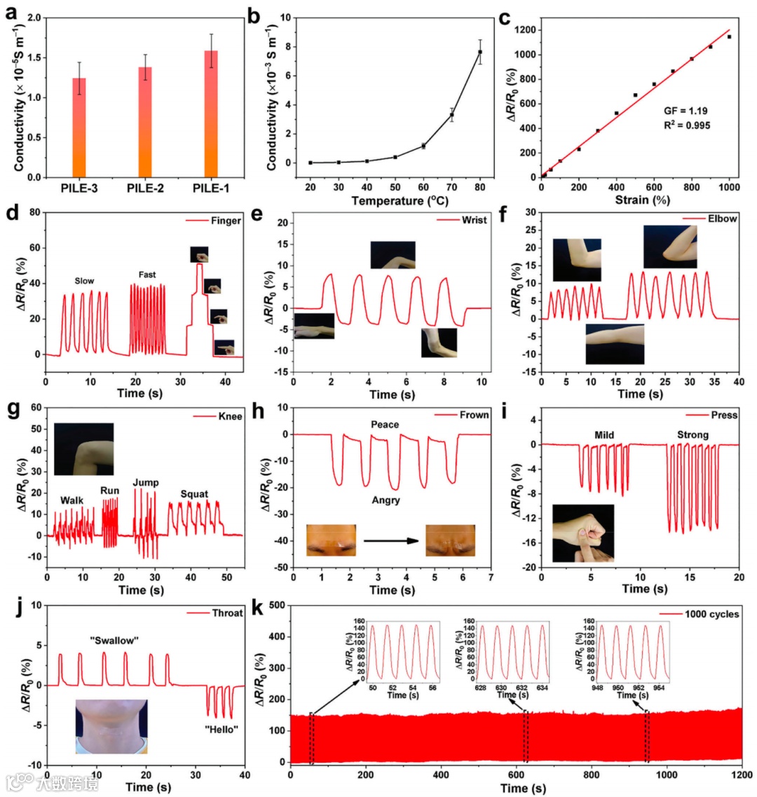 由于聚离子液体的存在,使该PILE具备导电性。基于此,可以将PILE应用在传感器领域,其在0-1000%范围内的灵敏度(GF)为1.19,并且可以实时地对人体关节的运动情况进行检测。除此之外,PILE对压力和声音还具有一定的识别功能,大大提升了其应用的范围(图5)。