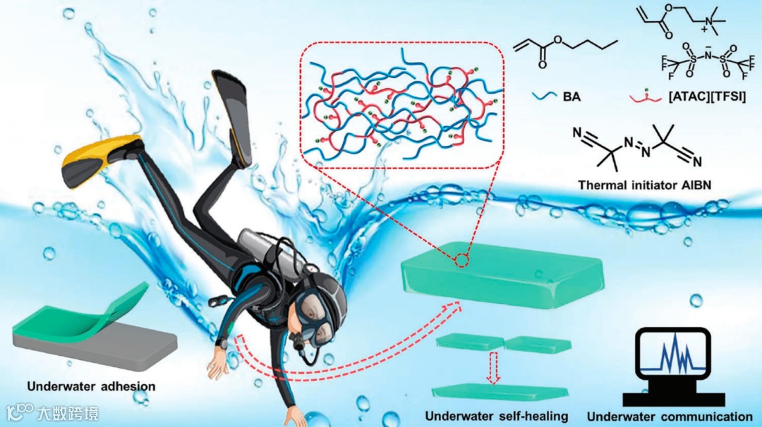 近年来,柔性导电材料在水下运动监测和隐蔽通信方面的应用引起了人们的广泛关注。聚离子液体弹性体(PILE)由于内部没有溶剂,可以避免在水下发生溶胀、电解质泄露等问题。但是,PILE仍然有拉伸性差、抗疲劳性差或易于屈服等问题。此外,由于水分子在界面处形成的水合层,会严重影响柔性材料与基底之间的粘附性。同时,水分子在弹性体断裂表面引起的离子溶剂化会导致弹性体自愈性能的显著降低,降低其可靠性和使用寿命。因此,设计具有优异力学性能、良好附着力和自愈能力的PILE对水下柔性导电材料的发展至关重要。