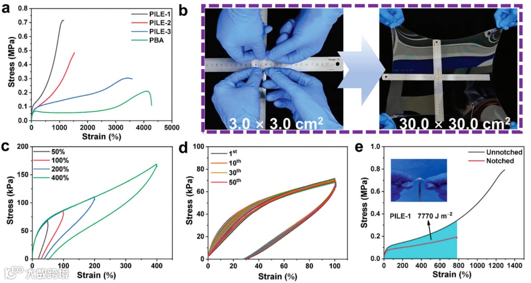 如图3所示,该PILE的力学性能可以通过改变两种单体的摩尔比来实现。而且,由于静电相互作用的可逆性,其在50-400%的应变下的加载曲线都能与上一圈的加载曲线完美地吻合。在100%的应变下循环加载-卸载50次,还发现该PILE具有优异的抗疲劳性能。同时,该PILE还具有较高的韧性和抗穿刺能力。