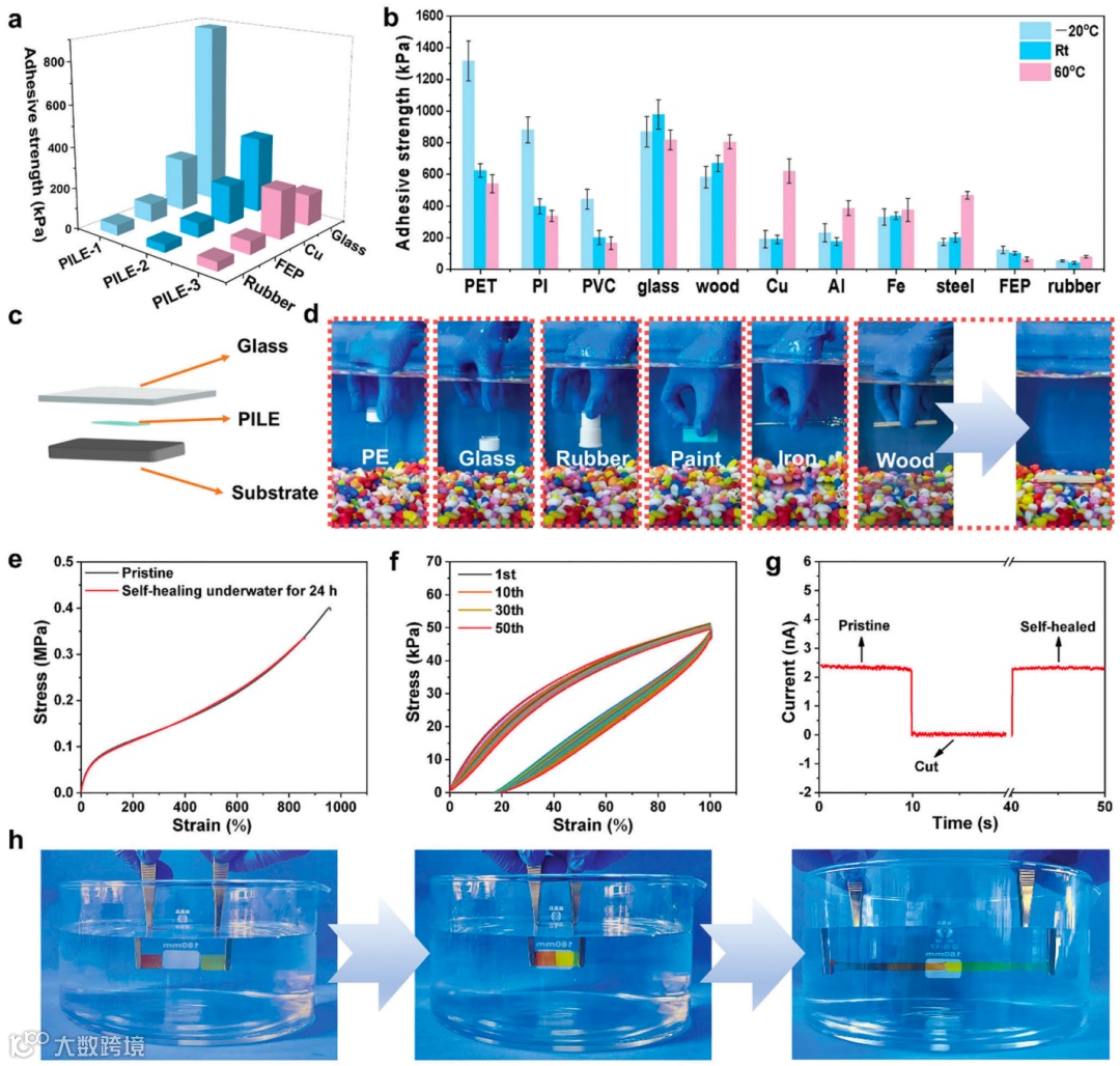 如图4所示,该PILE还具有较好的粘附性,在不同温度下,对不同基底都表现出了良好的粘附能力。由于该PILE的无溶剂特性和良好的疏水能力,其在水下也具有较好的粘附性。由于静电相互作用的可逆性,不管是在空气中还是在水下,该PILE都具有优异的自修复能力。而且,在修复后,其在加载-卸载过程中仍然能够保持优异的抗疲劳性。