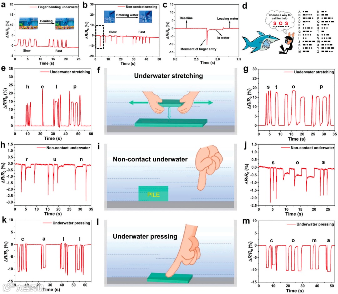 由于该PILE的疏水特性,可以将其应用在水下运动监测与通信上。在水下可以进行接触式(拉伸、按压)和非接触式传感。通过非接触式传感,还可以分辨物体在入水瞬间、在水中、离开水时等不同的状态。通过这些特性,将PILE应用在水下进行信号传输,可以用不同的方式传递出不同的摩斯代码信息(图6)。