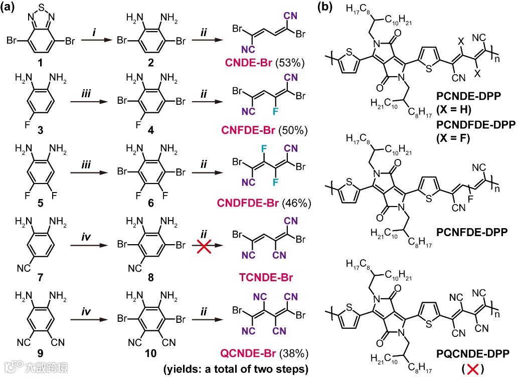 图2.氰基丁二烯类缺电子结构单元的合成路线(a),及其聚合物的分子式(b)。